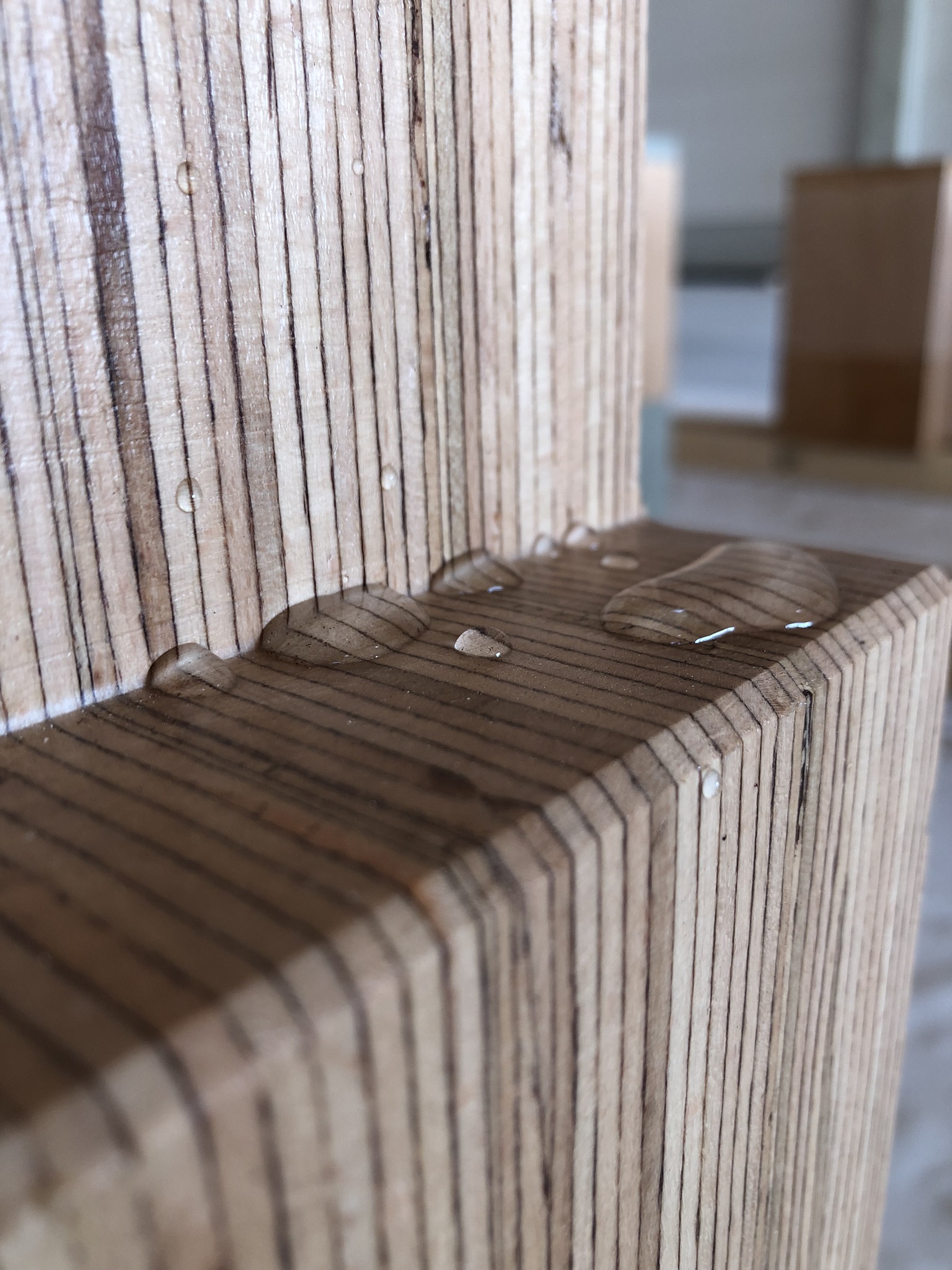 Der Einsatz der BauBuche ist ausschließlich in den Nutzungsklassen 1 und 2 zulässig, in denen der Werkstoff vor direkter Bewitterung geschützt ist. BauBuche hat größere Quell- und Schwindmaße als Nadelholz. Insbesondere im Bereich von Hirnholzanschnitten wie Balkenenden, Versätzen, Einschnitten und Löchern kann der Kontakt mit Feuchtigkeit zu erheblichem Quellen des Querschnitts führen. Darüber hinaus führt der Kontakt mit Feuchtigkeit zur Fleckenbildung. Da eine Bewitterung der Holzbauteile während der Bauphase kaum vollständig ausgeschlossen werden kann, suchte der Hersteller Pollmeier nach geeigneten Beschichtungssystemen, um den temporären Feuchteschutz der BauBuche während Transport und Montage zu gewährleisten. Wir haben uns der Herausforderung gestellt, und in Zusammenarbeit mit dem Hersteller geeignete Beschichtungssysteme entwickelt.